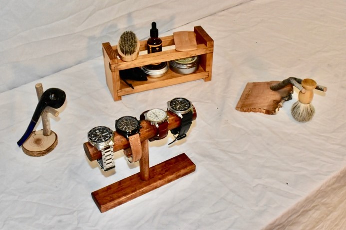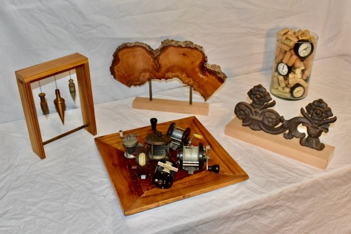 Okay, let’s look at three categories of project ideas: small, bigger, and BIGGER. If you want to dive into something that’s super-fun, but small (i.e., won’t take very long), tabletop décor or accessory stands might be right for you. Here are some items that I have in my home. My favorite—by a pretty wide margin—is the plumb bob art. You can find old plumb bobs at yard sales and flea markets, but sometimes they’re buried in your father’s or grandfather’s tool boxes. My dad gave me these three—they’ve been in the family for several generations, and I feel honored to display them.