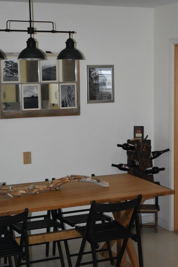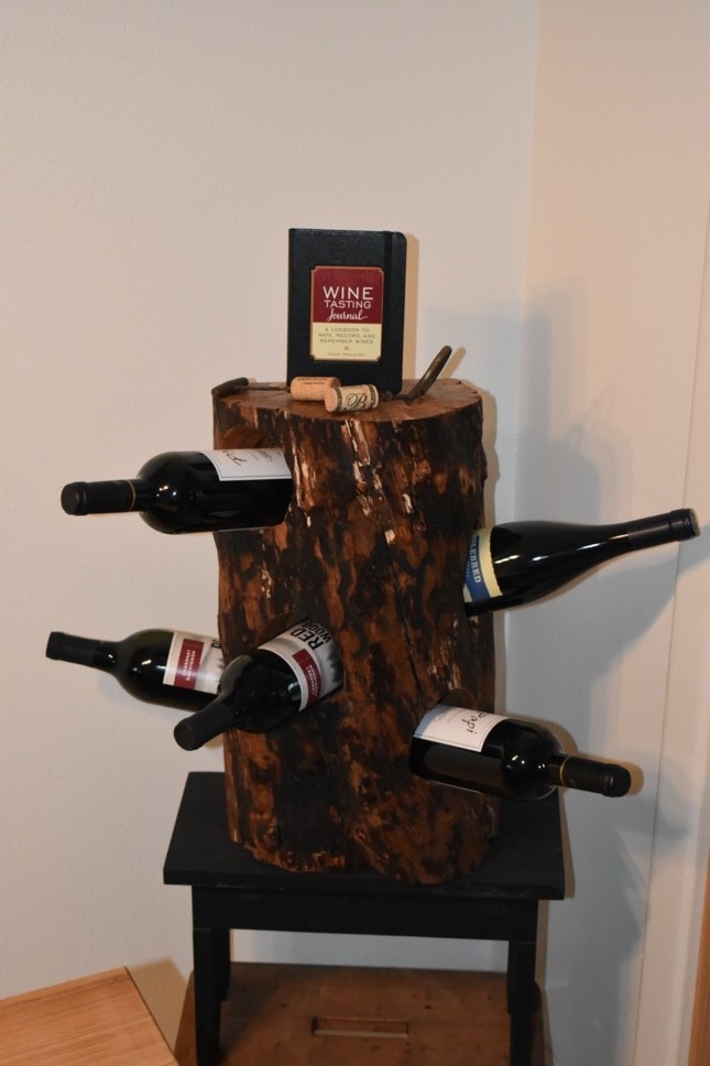 Just a word about the holes for these wine bottles…. Be prepared to work. You don’t need many tools to burrow into the stump—just a half-inch drill, hole saw, chisel, and mallet. But you do need a good amount of patience, especially if the wood is a hardwood. I enjoyed picking away at my rack a little at a time. And I LOVE the finished product. Even found a couple of antique cork screws for the top of the piece, along with a journal to record the wines I like best. Great addition to my dining room.